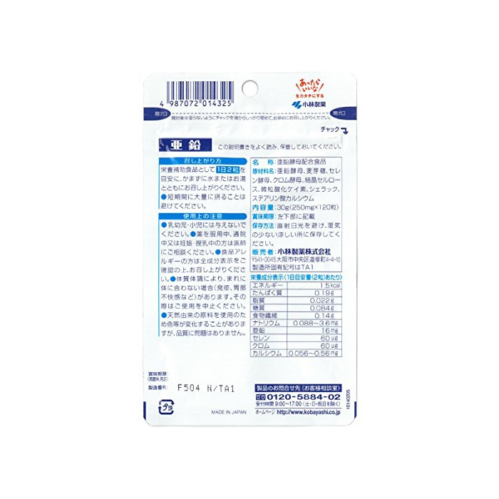 코바야시 제약의 영양 보조 식품 아연 덕용 약60일분 120알