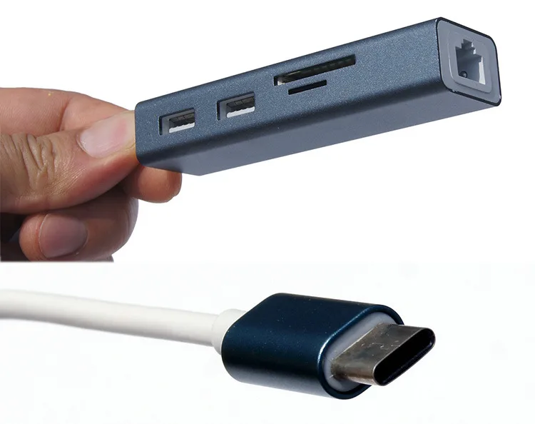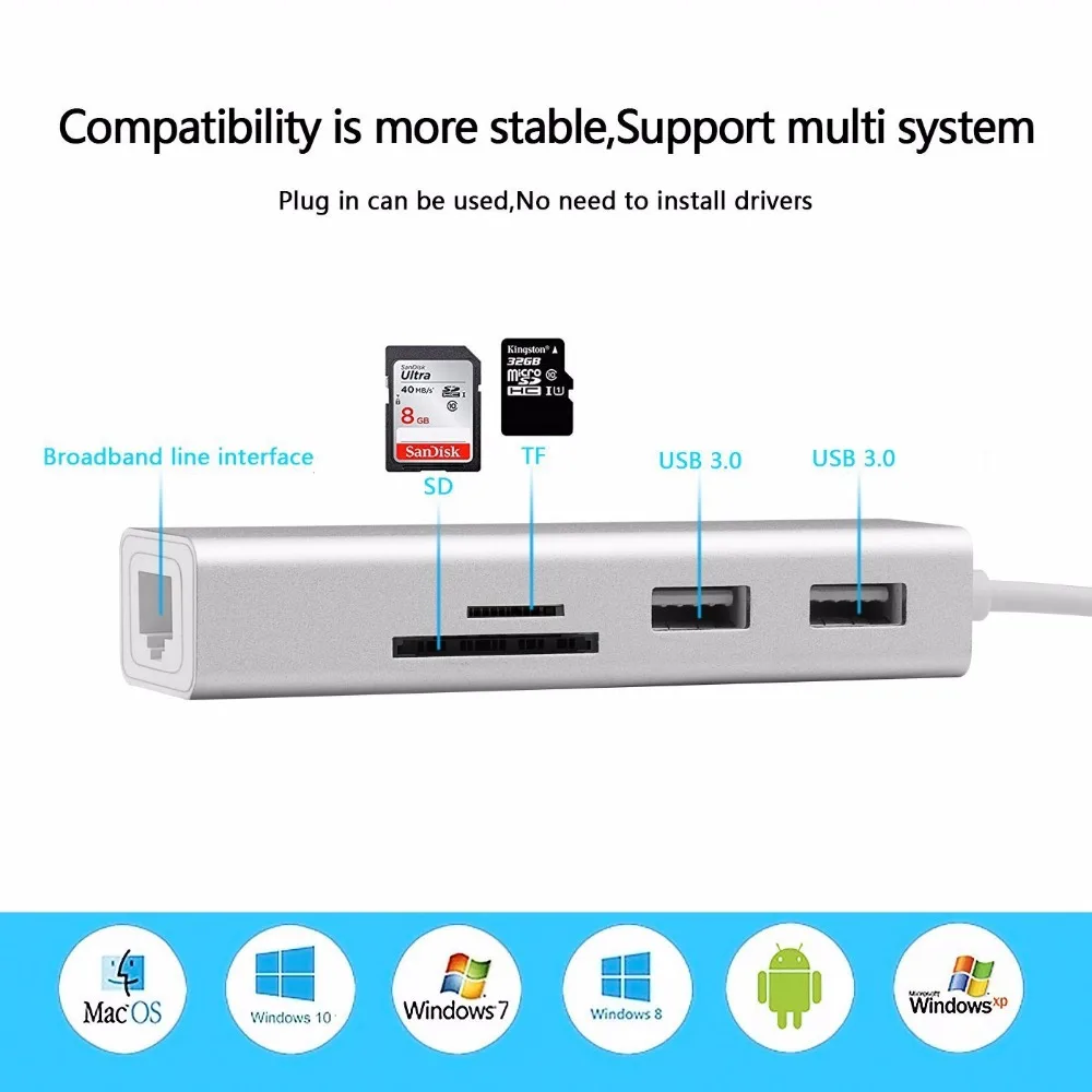 1. Multi function 5-in-1 USB Type-c Hub Adapter Converter Connector Dock [2 x USB 3.0 Ports, 1 x SD Card Slot, 1 x TF Card Slot, 1 x RJ45 10/100/1000 Gigabit Ethernet Network Adapter Converter]: adds USB 3.0, SD card Slot, Micro SD card Slot and Network Adapter to your Latest USB-C PC, Compatible with Macbook 12", Chromebook Pixel, One Plus 2 and other USB type C devices.
