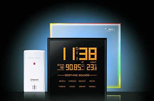 All-in-one atomic clock with soothing sounds to end your day. Wake up to any of the 4 soothing sounds and easily read the time with the large LCD display. The atomic clock will keep you always on schedule. Listen to your own music from your MP3 player with the line-in jack. Atomic time is always precise and never needs adjusting for Daylight Saving Time. The large LCD display and amber-colored EL Backlight makes it easy to read during low-light conditions. The crystal, color-changing lighting provides a relaxing atmosphere to unwind in any room. Features: 4 types of high quality soothing sounds; Beach, Garden, Delight & Relax. Sleep timer. Color changing effect on the transparent part of casing. Atomic clock with 8-minute snooze alarm (Buzzer or Soothing sound). Touch button for snooze/soothing sound selection. Line-in jack for playing music from MP3 player. Large LCD display with user selectable the brightness. 6.1-inch L by 1.9-inch W by 5.7-inch HFeature