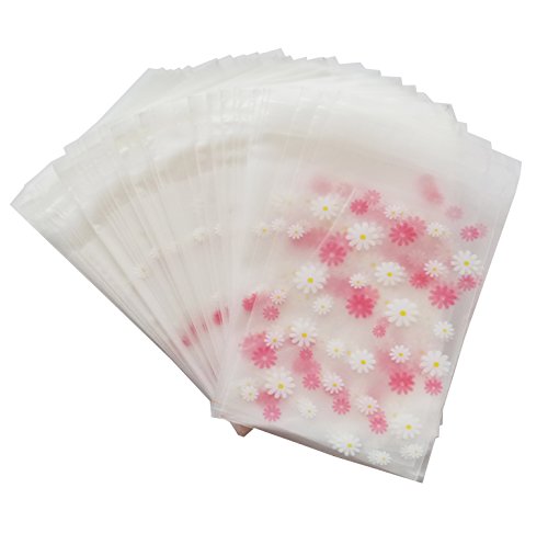 Yunko 100pcs Small Pink Daisy Cookie Packaging Self-adhesive Plastic Bags for Biscuits Package Good for Bakery Party Cz023