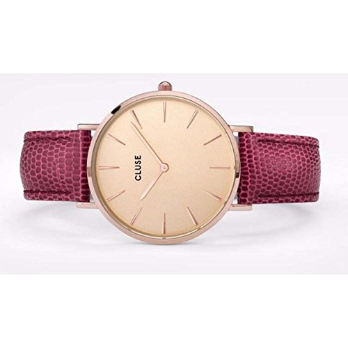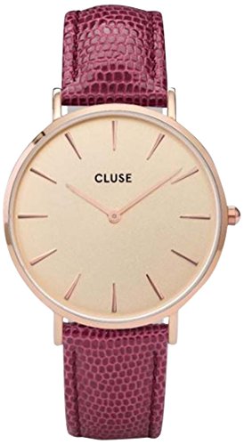 Brand, Seller, or Collection Name:CLUSE Model number:CL18040 Part Number:CL18040 Model Year:2017 Item Shape:Round Dial window material type:Mineral Display Type:Analog Clasp:Buckle Case material:Metal Case diameter:38 millimeters Case Thickness:10 millimeters Band Material:leather Band length:Women's Standard Band width:18 millimeters Band Color:Purple Dial color:Beige Special features:Water Resistant Item weight:1.76 Ounces Movement:Analog quartz Water resistant depth:30 Meters