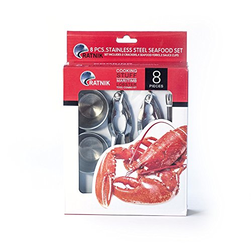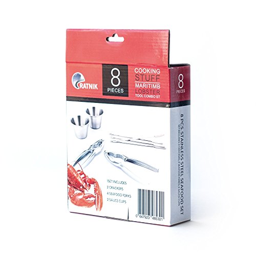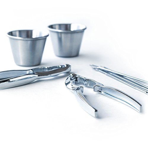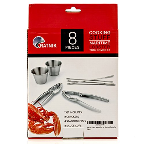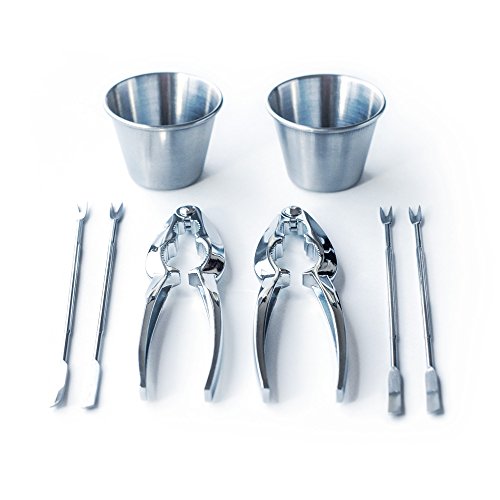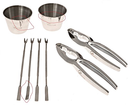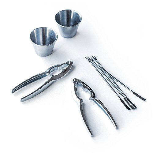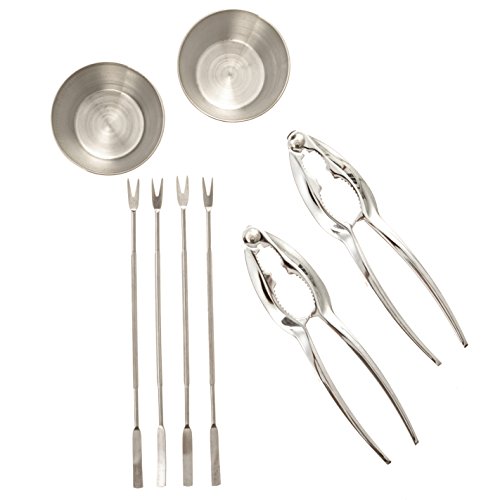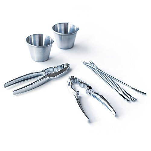 - 8 Pieces set of essential tools to help you enjoy the delicious meat hidden beneath hard shells and in crevices of crab, shellfish or a lobster - Transforms experience of eating seafood meals into a more Pleasant one and eliminates all the frustration - Premium quality finish, sturdy build and functionally effective design makes them an ideal choice for any modern kitchen - 2 Die-Cast Zinc Alloy Shell Crackers are ideal for Hard Shell Lobsters, Crabs, Shellfish, muscles and all your nuts as well - Cracking the shells becomes way easier with these crackers, which otherwise is the toughest task - Lobster Cracker comes with indentations to ensure a firm non-slip grip - Dual-ended Lobster Picks or Forks (4) make it easy to pierce or scoop out the meat and helps you eat any seafood in style and like a Pro - Optimum length of the crab forks makes it more convenient to handle them - Sauce cups (2) make it easy to have sauce of your choice or a butter dip handy, and the stainless steel finish goes great with other seafood tools set too