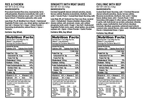 Assortment contains 12 pouches per bucket: 4- Rice and Chicken, 4- Chili Mac, 4 Spaghetti