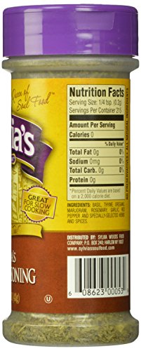 -. Feature : Case of 12 1.5-ounce canisters of salt-free seasoning (18 total ounces) / Contains basil, thyme, oregano, marjoram, rosemary, garlic, red pepper, and other herbs and spices / Salt-free, all-natural, no preservatives / Add to marinades or rub on meat and poultry; also great in dips / Used in world-famous Sylvia's Restaurant in Harlem, New York