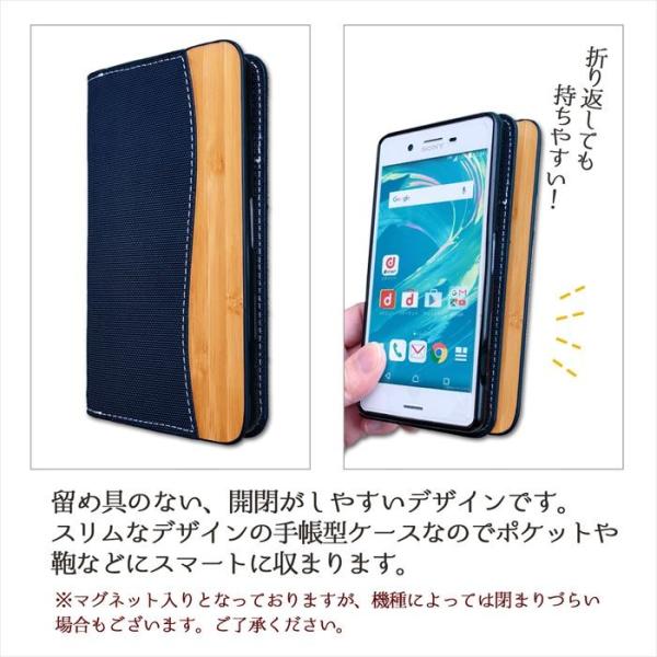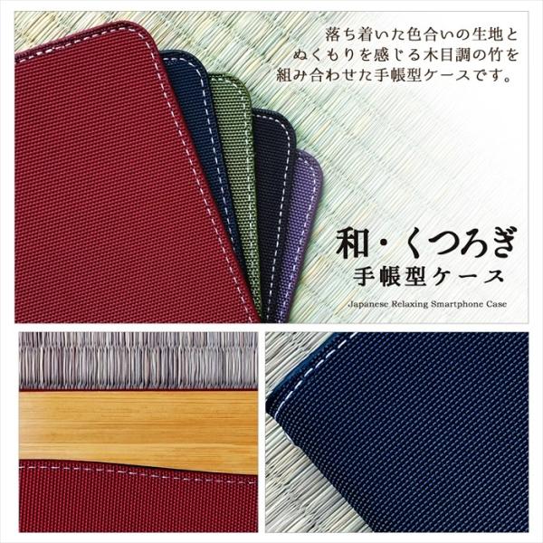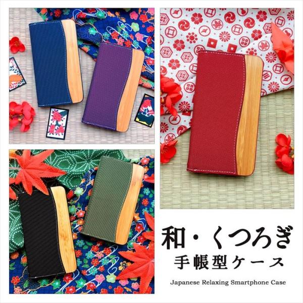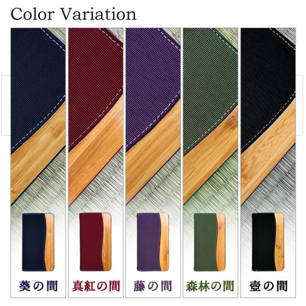 落ち着いた色合いの生地とぬくもりを感じる木目調の竹を組み合わせた手帳型ケースです。