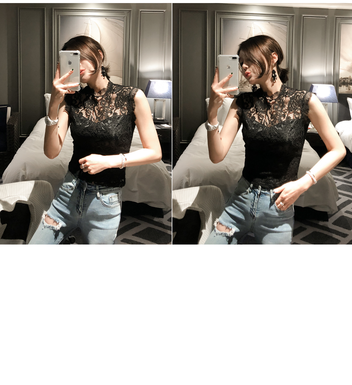 深いVネクにシースルーやカラにポイントを与えた上着とマッチすること好きです