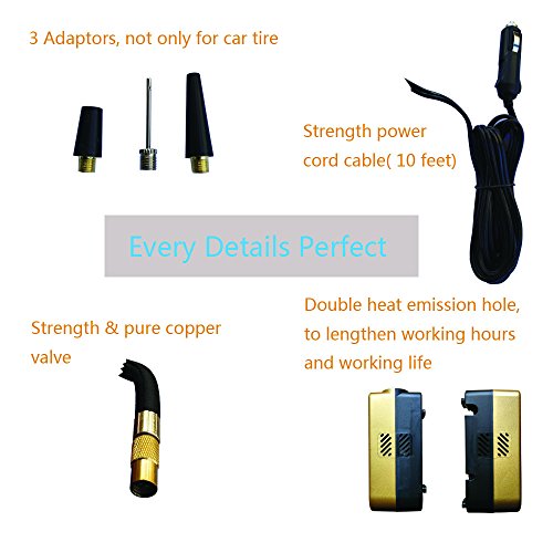 - Feature : ULTRA POWERFUL: Max 150 psi and 30L/min flow guarantee to inflate a mid-size tire less than 4 minutes from 0 to 30PSI ( less than 4.5 minutes from 0 to 35PSI). / LONG POWER CORD & AIR HOSE: 10 feet of power cord + 20 inch of air hose, make it easy to reach the tire of any size 12V car. / COMPACT AND EASY STORAGE: Only 6.5*6.3*2.7inch size and 2.3 pound weight,with a big chamber at the unit's back for power cord take in. / MULTI-FUNCTION: Bright LED light, Deflation button, 3 adapters for all kind of autos,bicycles,motorcycles,balls,etc. / Equiped with a pressure gauge(PSI/KPA/BAR).