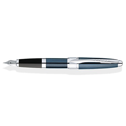 Pulsating with the glitz and glamour of 1980s-era Manhattan, this fountain pen with a solid 18 karat gold/rhodium plated nib, flaunts a pale blue European translucent lacquer over an engine-turned patterned engraved chrome. Polished chrome appointments create a subtle contrast, for the cool, connoisseurs of fashion. Includes 2 Black Fountain Pen Cartridges (8921). # ADDITIONAL INFO: 18k gold nib # Uses both cross cartridges and converter # Looks heavy but medium weight. Cool looking! WARRANTY: Life time Mechanical guarntee from Cross. # Genuine product from Cross . Buy from Authorized dealer only , # Brand New Condition . Guaranteed for quality