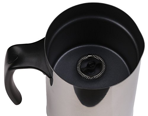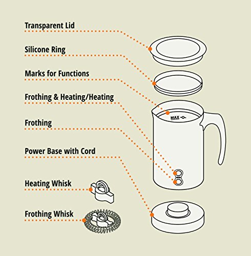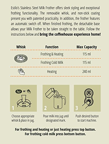 Makes hot or cold milk froth for cappuccino or iced drinks, heats milk for latte, hot chocolate and other hot drinks;Carafe detaches from base for easy pouring. Non-slip silicone base;Stainless steel with vacuum insulation helps contents maintain temperature. Heats cold milk to hot 150? in 80 seconds.;Non-stick coating interior for easy cleaning;115 ml frothing capacity and 240 ml milk heating capacity. Heating whisk can be found attach to the lid