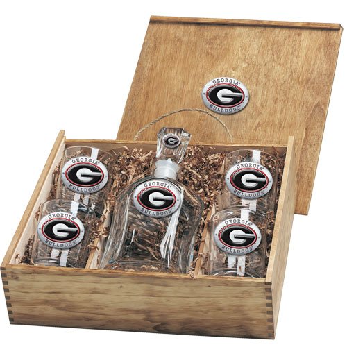 -. Feature : Georgia "Bulldogs" University Capitol Decanter Box Set / set contains one 24 ounce glass decanter and four (14 ounce) double old fashioned glasses. / A great addition to any home bar!