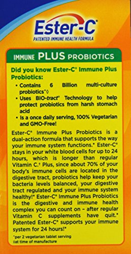 Ester-C with Probiotics goes above and beyond regular immune health formulas. Just one vegetarian-friendly tablet a day gives you the trusted, 24-hour immune support of patented Ester-C, plus 6 billion multi culture probiotics to further support immune health through healthy digestion. Your immune system is your body’s first line of defense – Ester-C with Probiotics is a dual-action formula that supports the way your immune system functions. Ester-C stays in your white blood cells for up to 24 hours, which is longer than traditional vitamin C.†Feature