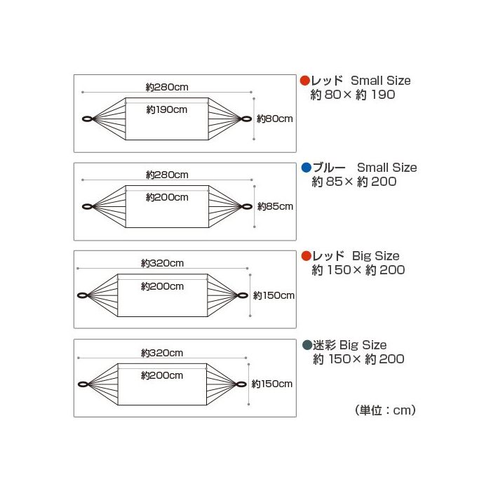 ■사이즈 일람(단위:cm) 【해먹(hammock) 넷각 사이즈】 레드 Big Size 약150×약200 미채 Big Size 약150×약200