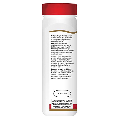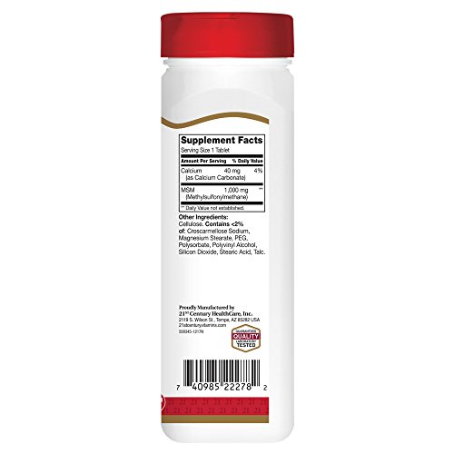 Methyl-Sulfonyl-Methane (MSM) is an organic sulfur unlike sulfur produced from an inorganic source such as methanol, a petroleum based product. MSM is biologically organic sulfur, a molecule found in food, plants, and every cell of the body. Organic sulfur is critical to the stabilization of the connective tissue matrix of cartilage, bones, tendons, and ligaments. Research has shown MSM is important for the synthesis of glycosaminoglycans and prevents certain enzymes from destroying healthy cartilage tissue.* Unconditionally guaranteed for purity, freshness and label potency. No Yeast, Preservatives or Artificial Flavors. 21st Century Vitamins and Supplements are manufactured in a cGMP facility under the strictest standards for product quality, including potency and purity. 21st Century prides itself on providing you with a great product at the best value. *This statement has not been evaluated by the Food and Drug Administration. This product is not intended to diagnose, treat, cure, or prevent any disease.Feature