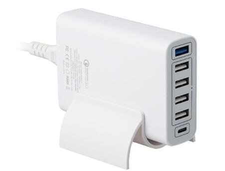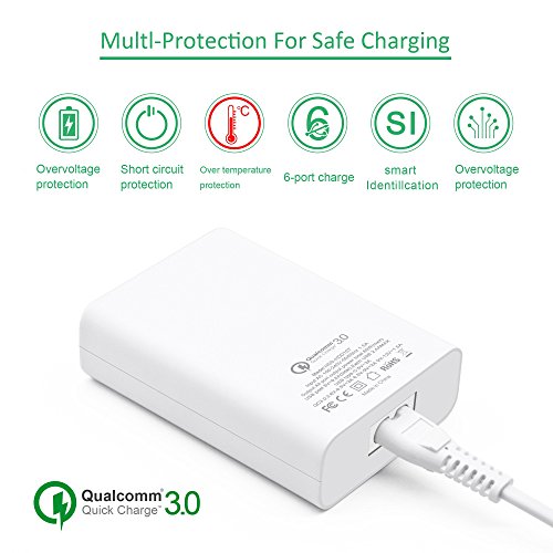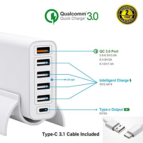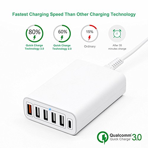 One Type C Port: Designed with advanced technology to provide the fastest charging speed of Type-C at 5V/3A; One Qualcomm QC 3.0 Port: Up to 4X faster than standard chargers, able to charge compatible devices up to 80% in just 35 minutes; Four Regular USB Smart Charge Ports: Smart IC automatically detects power requirement of devices plugged in (Max 2.4A/port).