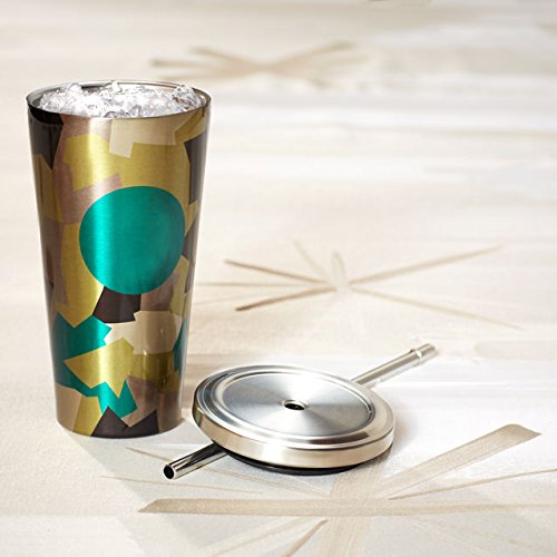 Not quite incognito, this double-walled, stainless steel tumbler with the black, gold and blue-green camo pattern is rather eye-catching.The Cold Cup's double wall construction helps keep iced tea and coffee beverages cold while eliminating condensation.A reusable stainless steel straw features a ridged bottom to help keep it in place. Plastic lid. Holds up to 16 fl oz. Handwash only. Do not microwave.
