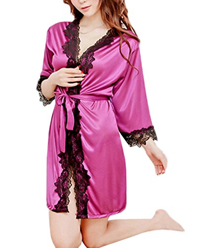 ZANZEA Women's Sexy Stain Lace Kimono Robe Mini Lingerie Pajamas + G-string + Belt Size One Size Fit For US S-M Blue