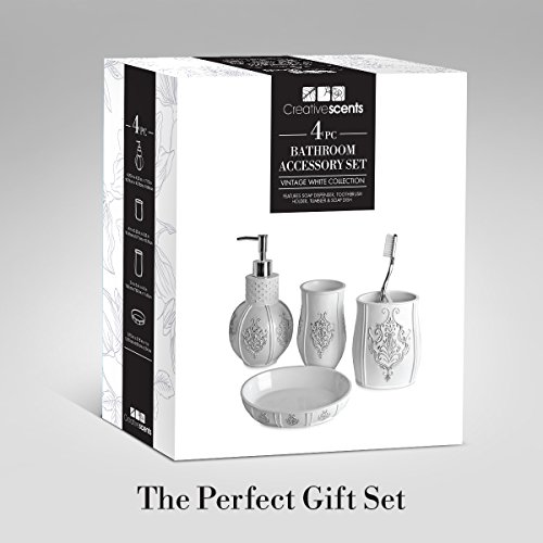 Vintage White Bathroom Accessories, 4 Piece Bathroom Accessories Set, Bathroom Set Features French Fleur-De-Lis Motifs, Soap Dispenser, Toothbrush Holder, Tumbler & Soap Dish - Bath Gift Set