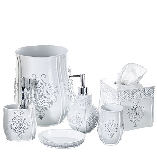 - TIMELESS ELEGANCE and UNIVERSAL COLOR: the curves, raised details of the silver colored French fleur delis motif combine to give the design a vintage look and feel that brings sophistication and style to any bathroom. Whatever your bathroom color scheme, this pristine white bathroom set will blend in perfectly; enhancing your décor with the splendor of French design that’ll definitely impress your guests