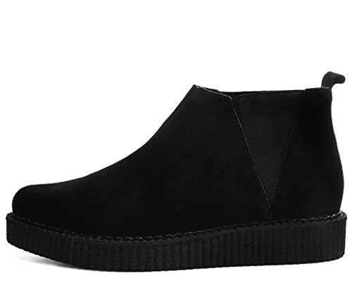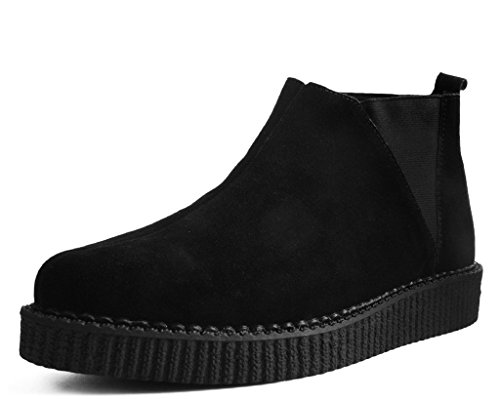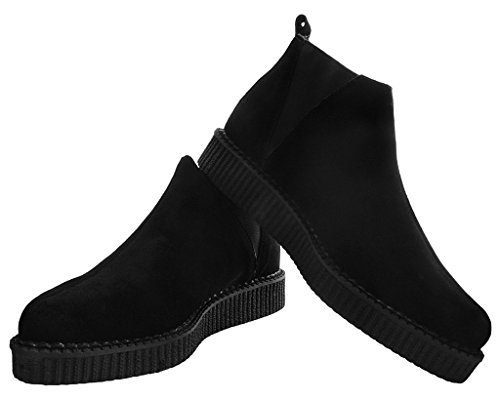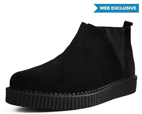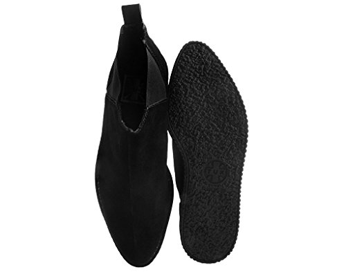 Binding : Apparel Product Description *Online exclusive, not available in stores* Sleek minimalist style and mod goth come together in this clean-lined Chelsea boot. Features a black cow suede upper with dual elastic goring for easy on-and-off wear. Sits on top of a low sole creeper platform that measures 1 ¼" at the heel and ¾" in the front. Has removable gel insoles for added comfort. 0