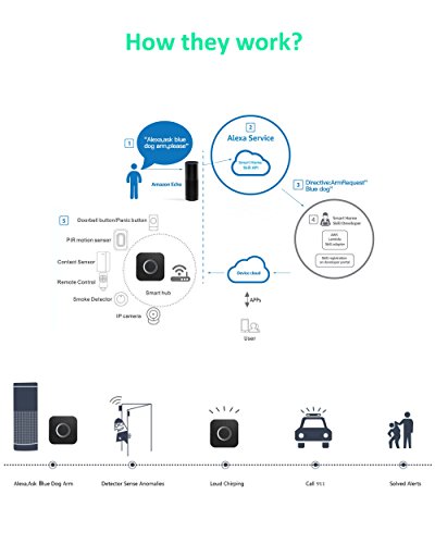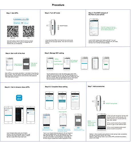 -. Feature : Fundamental & Extendable Smart Home Security System -- fundamental sensors available for normal use, and extendable with 50 items more sensors, door locks, cameras, light switches or dimmers etc / Work with Alexa, Voice control via Amazon Echo/Tap/dot -- Ask Alexa to set alarm or disalarm via WiFi hub. Easy to install - no drilling is needed. Doorbell let you never missing a visiting. / Remotely Monitor activity at your home via iPhone, iPad, Android smartphone or tablet anywhere & anytime -- Keep crime from your home just as any unwelcome intruders trigger the PIR motion sensor or door/window contact sensor is triggered, Alerts are sent via APPs push notifications. / Packed with 1x WiFi Hub, 1x remote control with Panic Button, 1x mini motion detector, 2x door/window contact sensors, 1x water-proof doorbell and manual. Follow the instructions in the manual carefully-- Step I) Install phone APPs 1. Get Apps via scanning QR codes or searching 'SSG An-Home' on Apple App Store or 'An Home' on Google Play; 2. Pair WiFi Hub by turning on its AP mode; 3. Manage WiFi setting of WiFi hub to let it connect the router in your house successfully. / Step II) Enable Alexa Skill 1. Enable SSG smart alarm skill by searching "Xiaoan" on Skill page of Alexa Apps; 2. Sign in with Xiaoan's SN and Password; 3. Grant link to Alexa, Talk to Echo/Tap/Dot with "Alexa, tell Blue Dog arm please (/diarm/state/ringing/alarm/mute)". Step III) Add accessories 1. Enter the pairing mode of WiFi Hub by short press the pairing button or from APPs; 2. activate that accessory and succeed with one beep. After all setting, not need phone any more.