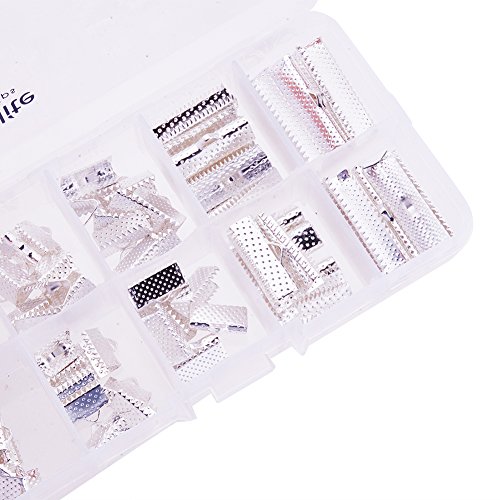 PandaHall Elite 100Pcs Assorted Sizes of Silver Ribbon Clamp End Crimps Bracelet Bookmark Leather Pinch Crimps Sets Size 8-25x6-8x5mm in Box for Jewelry Craft Supplies