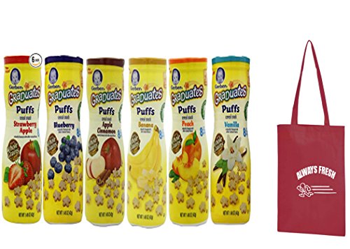 Nourish your little one with whole grain goodness by serving Gerber Graduates Puffs Cereal Snack at snack time . Gerber Graduates Puffs Cereal Snack have 2 grams of whole grains per serving, and 5 vitamins and minerals making them an ideal snack for your older baby learning to self feed. Gerber Graduates Puffs Cereal Snack are easy to chew and swallow and are just the right size for little hands to pick up and enjoy.Feature