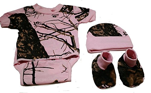 -. Title : Pink Mossy Oak Camo 3 PC Baby Set includes Matching Diaper Shirt, Hat & Booties