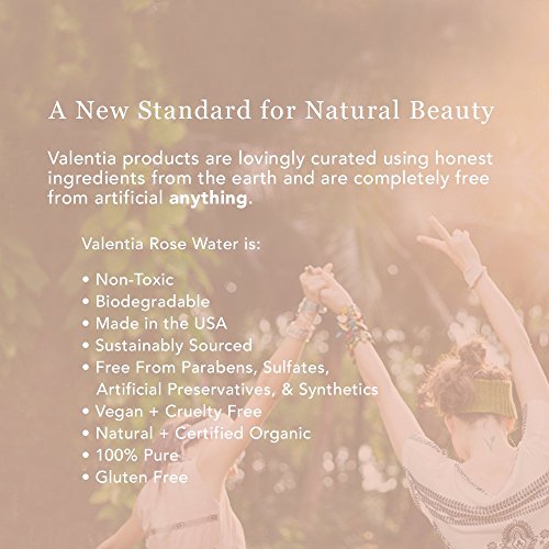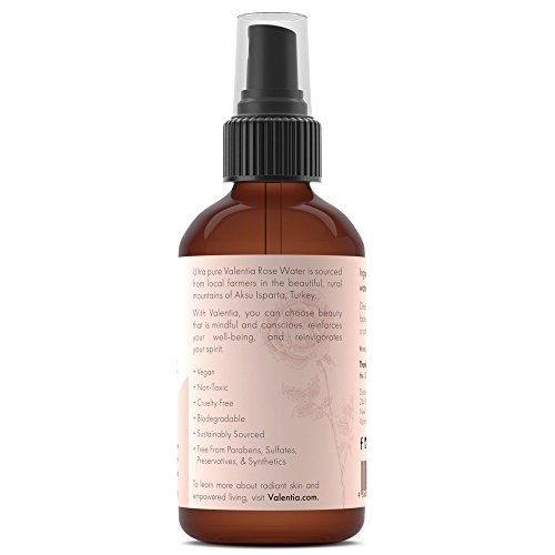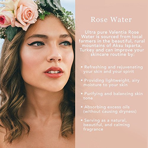 -. Feature : Nourish Your Skin With the Highest Quality Available. Valentia Rose Water is USDA Certified Organic, 100% pure, synthetic-free, unrefined, and never tested on animals. Our rose water is all-natural, and distilled to perfection using organic roses and steam by local farmers in the beautiful, rural mountains of Aksu Isparta, Turkey, so you can feel rejuvenated by this intoxicatingly beautiful all-purpose elixir each day. / Feel Refreshed in Seconds. The natural properties and therapeutic aroma of Valentia's Turkish Rose Water will hydrate and reinvigorate your face, neck, and body and give you a light, uplifting, and irresistible fragrance so you can take on the world in your fullest form. / Cleanse, Tone, and Balance. Rose water is a rich source of antibacterial properties and empowering nutrients, including antioxidants and essential fatty acids that work together to clear dead skin cells, absorb excess oils, and even out the color, tone, and quality of your skin. As Mother Nature's perfect toner, this beautiful flower water will balance your skin's pH to unveil a bright, refreshing, and radiant glow. / Clear and Soothe Troubled Skin, Naturally. Whether your skin is extra sensitive, easily irritated, or prone to breakouts, blackheads, and clogged pores, Valentia Rose Water will deliver the gentle and calming nourishment it needs in the form of vitamins A,C, D, and B6, along with natural antibacterial properties to restore balance each day. / Enjoy a Youthful, Glowing Complexion. Rose water is a powerful yet gentle astringent that contains the essential elements to reduce the appearance of dark spots and help your skin feel firm, fresh, soft, and supple. Get a healthy, dewy glow to match your vibrant, empowered soul with this pure, premium, and indulgent eau de roses.