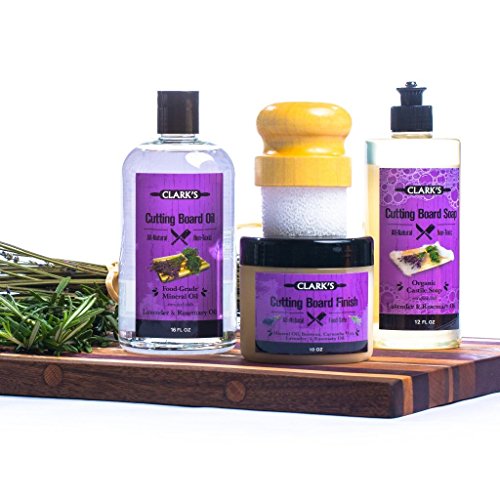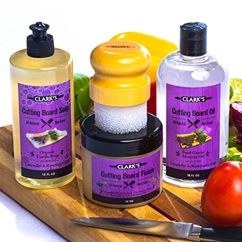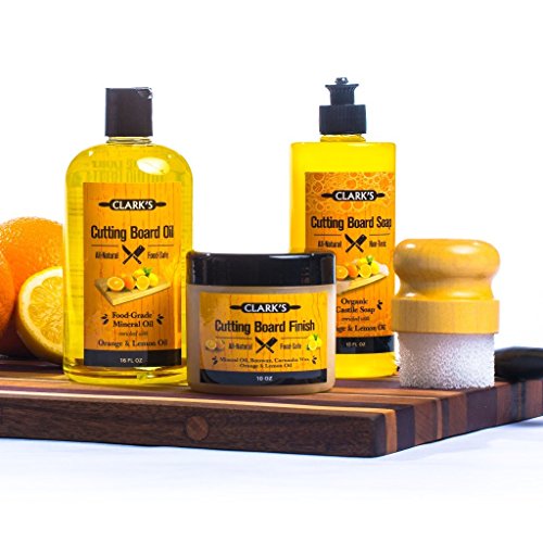 -. Feature : EVERYTHING IN ONE CONVENIENT SET - CLEAN with CLARK'S Soap, CONDITION with CLARK'S Oil and & PROTECT with CLARK'S Wax. Finally, the complete solution for maintaining your new or aged Cutting Board, Butcher Block, Bamboo Cutting Boards, Salad Bowls, Wood Utensils and Wood Countertops. / INCLUDES: CLARK'S Cutting Board Soap (12oz), Cutting Board Oil (16oz), Cutting Board Wax (10oz) & CLARK'S Custom Applicator. Designed to work seamlessly together to beautify and restore your cutting boards. / CLARK'S OIL PENETRATES WOOD DEEPLY - Oil works its way deep into the grain of Butcher Blocks & Cutting Boards. CLARK'S WAX ADDS A PROTECTIVE BARRIER - After applying the oil, add another layer of protection from unwanted liquids seeping into your kitchenware by using CLARK'S Wax. / SAVE MONEY - When you buy our combo packs. Who doesn't like that? / SAFEST PRODUCTS ON THE MARKET - All CLARK'S products are formulated with FDA approved ingredients for direct and indirect contact with food.