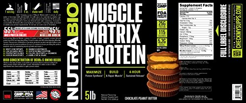 NutraBio Muscle Matrix Protein - Chocolate Peanut Butter 5lb 4-HOUR COMPLETE PROTEIN MATRIX HOW DOES IT WORK? * Slow Digesting Anti-Catabolic Protein lasts up to 4 hours. * Contains an advanced full-spectrum amino acid profile. * No whey concentrate, caseinate or dairy creamers. * No proprietary blends - No protein spiking * 55% Whey Protein Isolate - 45% Micellar Casei