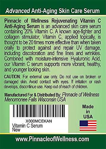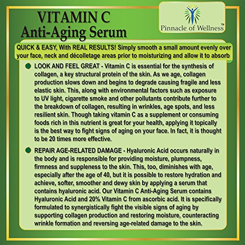 -. Binding : Misc. -. Brand : Pinnacle of Wellness -. EAN : 0784672390415 -. Feature : FREE BONUS WITH YOUR ORDER! $37 Value - Five "must read" Skin Care eBooks - Think Clean and Green... to Flawless Skin, Top 10 Tips for Healthy Glowing Skin, Fight Acne with Quick and Easy Tips, 11 Habits to Make or Break for Soft Flawless Skin, 5 Common Skin Problems - Answered! You will receive an email one hour after your product ships with all five Skin Care eBooks attached as a PDF document absolutely free. / PURCHASE WITH CONFIDENCE - 90-Day - Complete Satisfaction - Money-Back - Triple Guarantee. Just try Vitamin C Anti-Aging Serum for yourself for a full 90 days. If you do not see or feel the results you expect in those 90 short days. Or, if you do not notice an improvement in your skin in the first 45 days. Or, even if you just don't like the color of the label, the amount of turns it takes to remove the cap. You name it. We'll gladly refund your money, no hassles. / LOOK AND FEEL GREAT - Look as young on the outside as you feel on the inside! Vitamin C is essential for the synthesis of collagen, a key structural protein of the skin. As we age, collagen production slows down and begins to degrade causing fragile and less elastic skin. This, along with environmental factors such as exposure to UV light, cigarette smoke and other pollutants contribute further to the breakdown of collagen, resulting in wrinkles, age spots, and less resilient skin. Though taking vitamin C as a supplement or consuming foods rich in this nutrient is great for your health, applying it topically is the best way to fight signs of aging on your face. In fact, it is thought to be 20 times more effective. / REPAIR AGE-RELATED DAMAGE - Hyaluronic Acid occurs naturally in the body and is responsible for providing moisture, plumpness, firmness and suppleness to the skin. This, too, diminishes with age, especially after the age of 40, but it is possible to restore hydration and achieve, softer, smoother and dewy skin by applying a serum that contains hyaluronic acid. Our Vitamin C Anti-Aging Serum contains Hyaluronic Acid and 20% Vitamin C from ascorbic acid. It is specifically formulated to synergistically fight the visible signs of aging by supporting collagen production and restoring moisture, counteracting wrinkle formation and reversing age-related damage to the skin. / QUICK & EASY, With REAL RESULTS! Simply smooth a small amount evenly over your face, neck and décolletage areas prior to moisturizing and allow it to absorb. Use in the morning and at night before bed. Because serums are more concentrated than regular moisturizes, dermatologists believe their effectiveness is the result of deeper penetration to problem areas. Our Vitamin C Anti-Aging Serum is richer and thicker than most, and it's great for all skin types. After applying, allow it to dry then follow with your favorite moisturizer. -. MPN : 3177035 -. PackageQuantity : 1 -. PartNumber : 3177035 -. ProductGroup : Beauty -. ProductTypeName : BEAUTY -. Title : (2oz) 20% Vitamin C Anti Aging Serum with Hyaluronic Acid - Best Facial Skin Care Product for Women and Men - The Smart Choice for More Vibrant, Healthy & Younger Looking Skin - You Get Two Fluid Ounces for Less Than the Price of One - Experience the Convenient Premium Pump that Works Better Than the Traditional Amber Dropper Bottle which means Less Waste, Saving You Money while Delivering You a Richer and Thicker Formula in an Easier Way - SPECIAL BONUS! - 5 "Must Read" Skin Care eBooks with Your Order! A $37 Value Absolutely FREE - Buy with Confidence - 90-Day Money Back Triple Guarantee! -. UPC : 784672390415