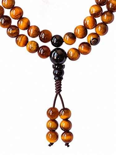 These mala beads are a striking choice, with 108 6mm tiger eye beads, three 6mm obsidian marker beads, one 8mm obsidian guru bead, and six 6mm tiger eye beads on the tassel.