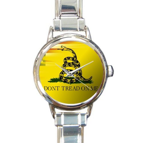 -. Binding : Misc. -. Brand : Flag Watch -. Color : Liightgrey -. Department : Mens -. EAN : 6065690632614 -. Feature : 100%stainless steel / The watch band comes with 16 starter links / The watch face measures approximately 7/8". / MIYOTA stainless quartz cassette mechanism and battery / Best Birthday Gift Soft black plastic watch strap and hard plastic watch winder -. Label : Flag Watch -. Manufacturer : Flag Watch -. ProductGroup : Apparel -. ProductTypeName : SPORTING_GOODS -. Publisher : Flag Watch -. Size : 0.75x3.4 -. Studio : Flag Watch -. Title : Personalized Watch Gadsden Flag Don't Tread On Me Round Italian Charm stainless steel Watch