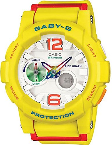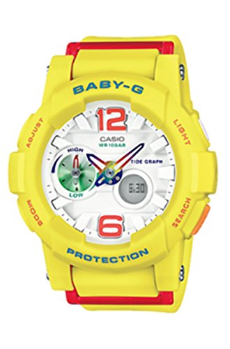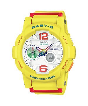 Studio : Casio Publisher : Casio Binding : Watch Product Description Casio - G-Shock - G-GLIDE - Beach Fashion Series - Yellow - BGA180-9B - From BABY-G G-LIDE, a collection of new color specially selected to match todayOs beach fashions. The analog BGA-180 features a multi-dimensional sculptured design decorated with neon yellow, pink, blue, and other colors for a sporty look that always looks great. A Olug protectorO made of fine resin on the band not only creates an attractive design element, it also helps to protect the back of the watch from impact. A textured band surface also adds a distinctively sporty touch. Feature-wise, the BGA-180 is the first analog model in the BABY-G lineup to include a TIDE GRAPH feature. In the Timekeeping Mode, the small hand of the dial at 9 oOclock normally indicates current tide information. Each press of the button at 4 oOclock in the Timekeeping Mode advances the tide information indicated by the dial hand by one hour. A great design, powerful features to support surfing activities and much more makes this model the perfect choice for todayOs active women. Mineral Glass - Shock Resistant - 100-meter water resistance - LED light - Selectable illumination duration, afterglow - World time: 31 time zones (48 cities coordinated universal time), daylight saving on/off, Home city/World time city swapping - Hand shift feature (Hands move out of the way to provide an unobstructed view of digital display contents.) - Thermometer - Moon data (moon age of the specific date) - Tide graph (tide level for specific date and time) - Tidal Trend Indicator (Shows tidal changes over the next 12 hours.) - 1-second stopwatch - Countdown timer - Daily alarm - Hourly time signal - Full auto-calendar (to year 2099) - 12/24-hour format - Button operation tone on/off - Accuracy: ±30 seconds per month - Approx. battery life: 2 years on SR726W _ 2 - Size of case:_49.3___44___15.4mm - Total weight: 46g 0