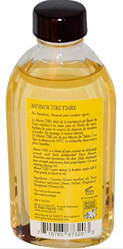 Monoi Tiki is a blend of pure coconut oil delicately scented with fresh handpicked Tiare flowers. Nourishes and moisturizes the skin. Helps maintain hair strength and protects from wind dryness.Feature