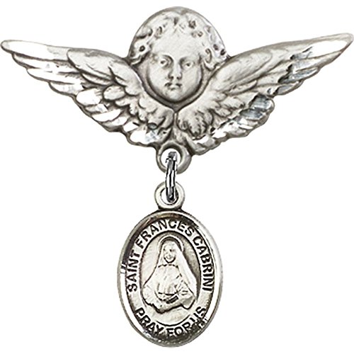-. Title : Sterling Silver Baby Badge with St. Frances Cabrini Charm and Angel w/Wings Badge Pin 1 1/8 X 1 1/8 inches