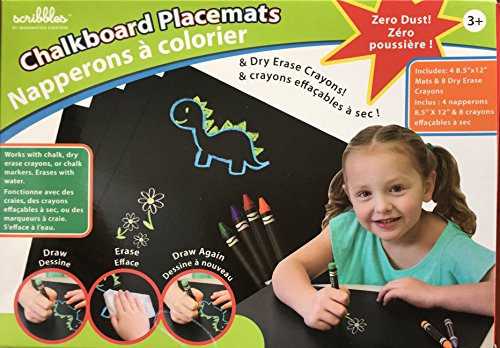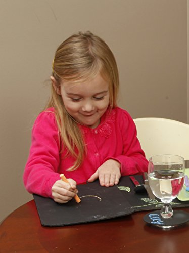 Chalkboard placemats make waiting for dinner a breeze! These new chalkboard placemats are made of a specially formulated food safe plastic. Let the kids doodle, draw, wipe off and repeat while the adults get dinner ready. These innovative kid-friendly placemats can be used with chalk markers, dry erase crayons and regular chalk (bright colors show up best, the included dry erase crayons were specially designed by Crayola to show up on a black background). When they are done with dinner, just wipe them off at the table or pop them in the sink and wash them off with soap and water. These make a great gift for kids and parents alike.