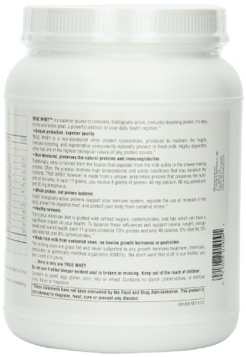 -. Feature : True whey is a non-denatured whey protein concentrate, produced to maintain the fragile, immune-boosting, and regenerative components naturally present in fresh milk, / Highly digestible. Whey has one of the highest biological values of any protein source. / True whey is made from a unique, proP.R.Ietary process that preserves the nutrients of the whey. In each 10 grams, you receive 8 grams of protein / Superior source of complete, biologically active, immunity-boosting protein / Easy to mix and tastes great / Powerful addition to your daily health regimen / Made from a unique, proP.R.Ietary process that preserves the nutrients of the whey / In each 10 grams, you receive 8 grams of protein, 900 mg immunoglobulins, 190 mg lactoferrin, 40 mg calcium, 60 mg potassium, and 30 mg phosphorus