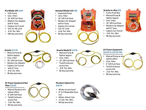Search Gentap to see all models -GasTapper Gravity Model B is a powerful hand siphon that also comes with a bypass line so once the siphon is started, you can open up the bypass to use gravity for transfer.(Model B does not have the modern car adapter & funnel). This a great and affordable alternative to the GasTapper 12V sold here on Amazon. All fittings are over-sized to increase fluid transfer. Intended to help move gasoline, other fuels and water without having to siphon or get a mouthful of gas in the process. Move gas from one gas tank or container to another. Use this around the home, while camping, filling recreational vehicles, small engines and emergencies. GasTapper Gravity is a manual pump. It will start a siphon flow and then you can open the bypass line to move fuel or liquids rapidly. The bulb has high quality tight valves which allows you to actually pump fuel above the source. 9' of FuelFlex® 65 3/8 inch Fuel line, -Top quality siphon bulb with aluminum ends and rubber valves. This is not a throwaway tool. It is well made.Feature