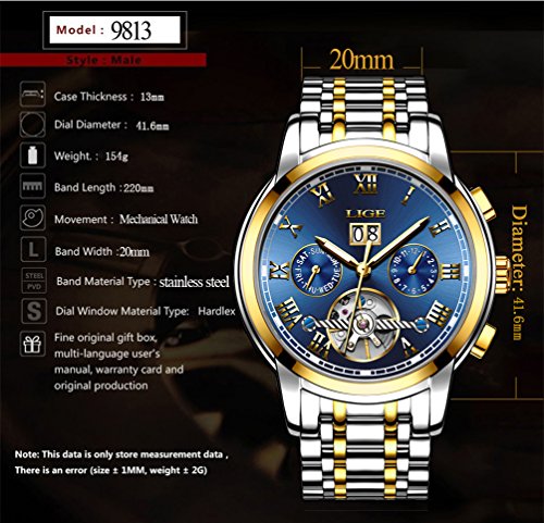 Size:case diameter:41.6 mm/1.64in;case thickness:13 mm/0.51in;band width:20 mm/0.79in;band length:220 mm/8.67in; wight:154g