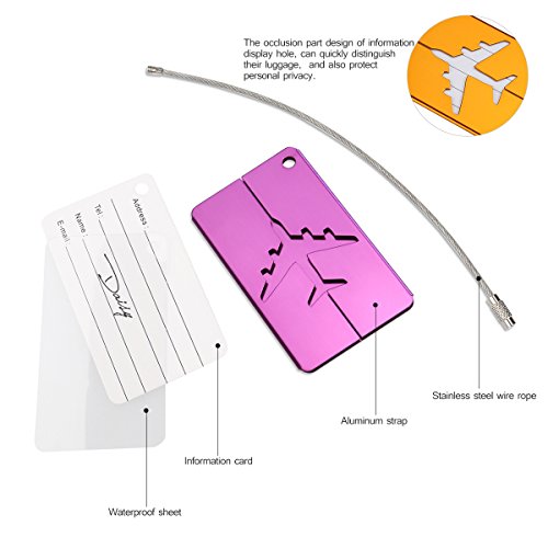 - Color: 8Colors for you to choose, silver, black, blue, red, yellow, brown, Purple, Pink. - Material: Aluminum alloy. - Dimension: about 7.5 * 4.4cm. - You can write your NAME and ADDRESS on the name card, for easy to identify your luggage from others. - Come with a string and a screw connector for closely connecting your luggage. - Bright colours help you to pick out you luggage at your first sight, so don't worry about take the luggage by mistake.