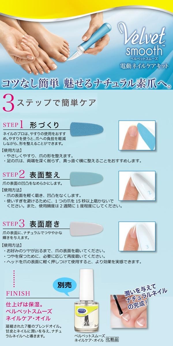 ベルベットスムーズ・電動ネイルケアキットの付け替え用ヘッドです。形づくり、表面整え、表面磨きの3ステップで手軽にナチュラルで輝きのある爪へと導きます。 |