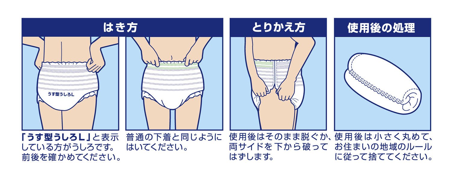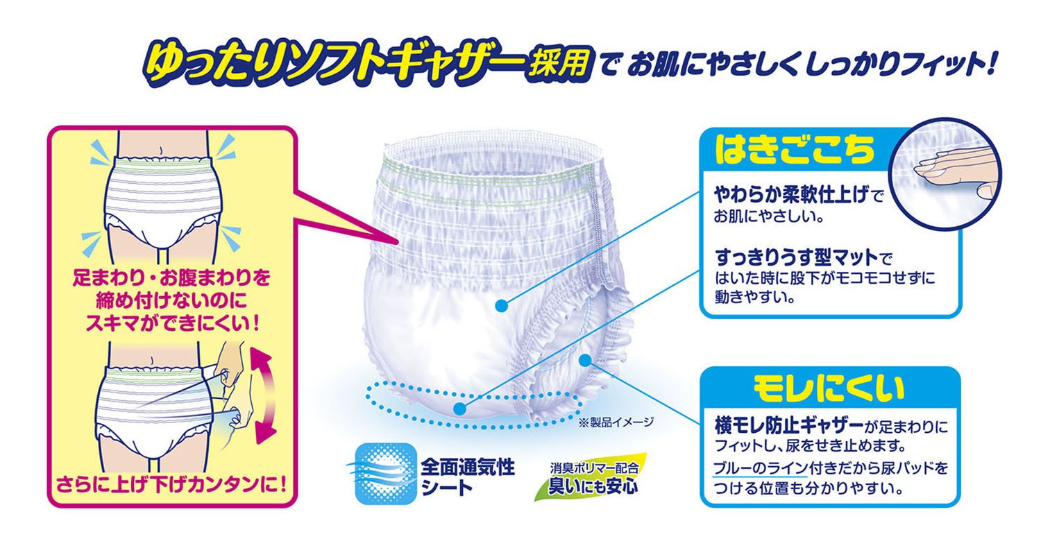 ● Easy to wear ● Easy to move ● Relaxing soft gather ● Cleansing mat type ● Comfortable to the skin ● Overall breathable sheet ● Fluffy soft material ● Difficult for leakage ● Gore peeling off laterally ● About two pee ● Deodorant polymer blend