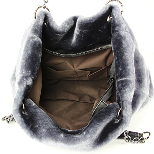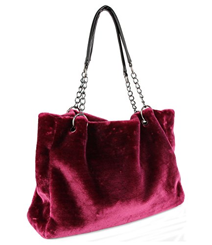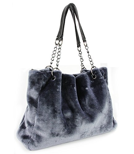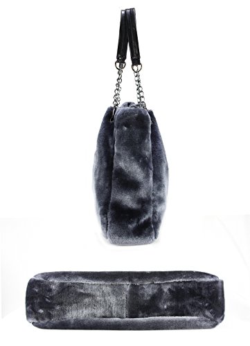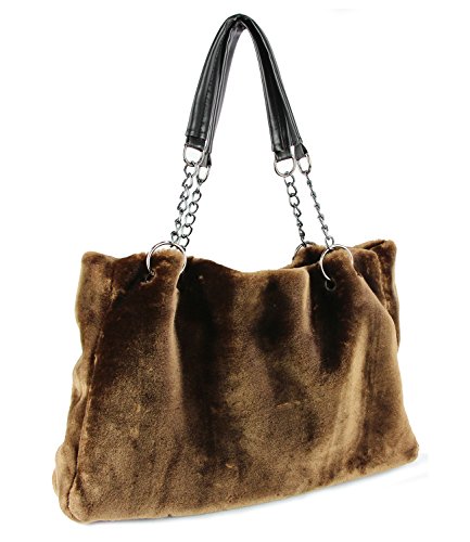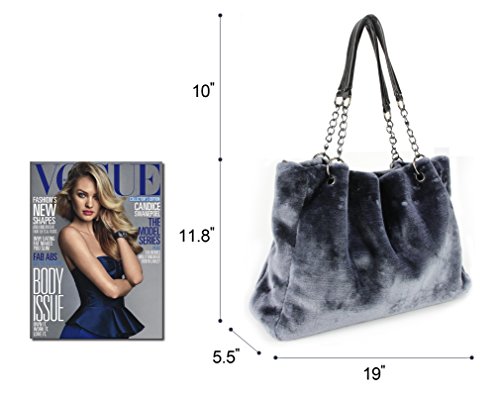 -. Feature : Made of fuax fur and synthetic leather; Lined: polyester / Large Size: 19"L x 11.8"H x 5.5" W; Height of Handle: 10'' / Structure: full lined with 2 open pockets, large capacity enough to store your ipad, phone, book, documents, umbrella, cosmetics and other daily necessities / Soft and pure color design, come with double chain top handles, high grade top zipper closure can well protect your stuffs / It is a elegant and perfect tote bag for the autumn and winter, you can use it for working, dating, school, business or any gathering