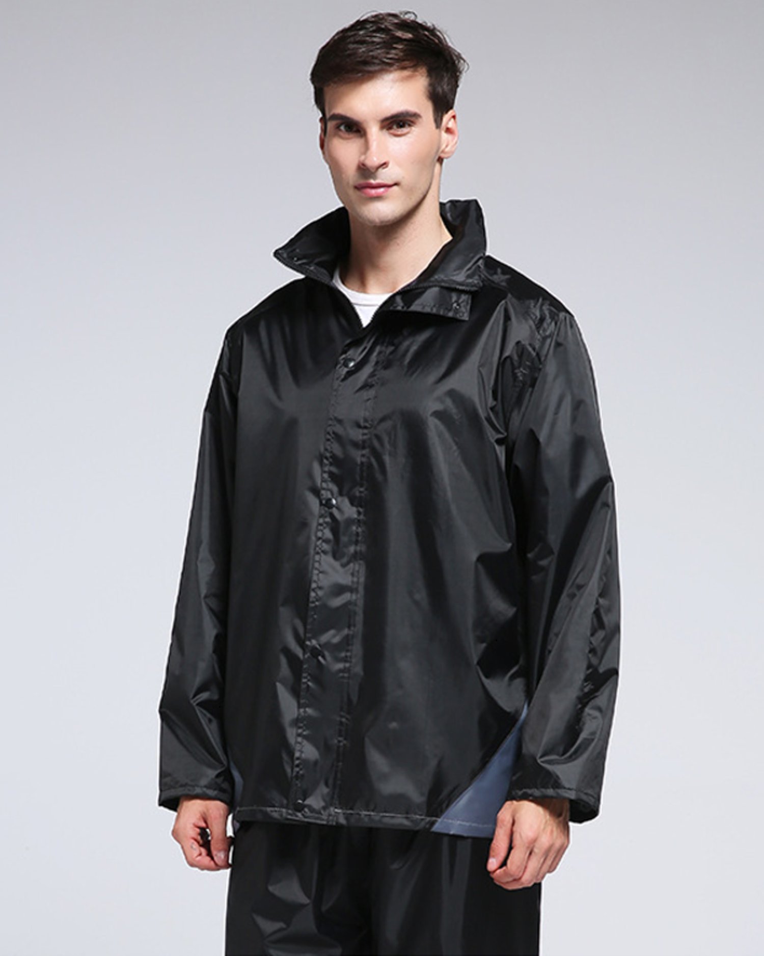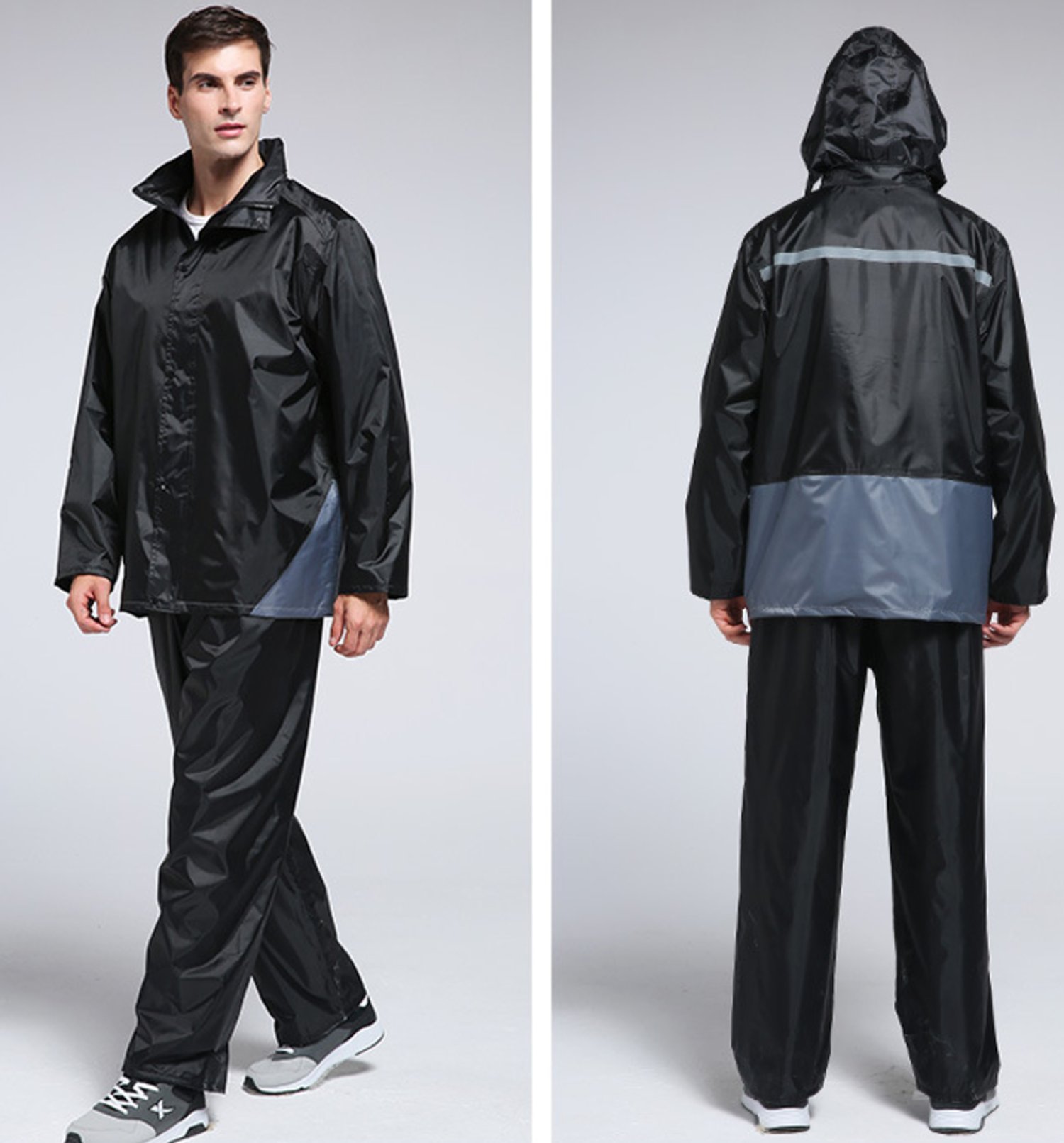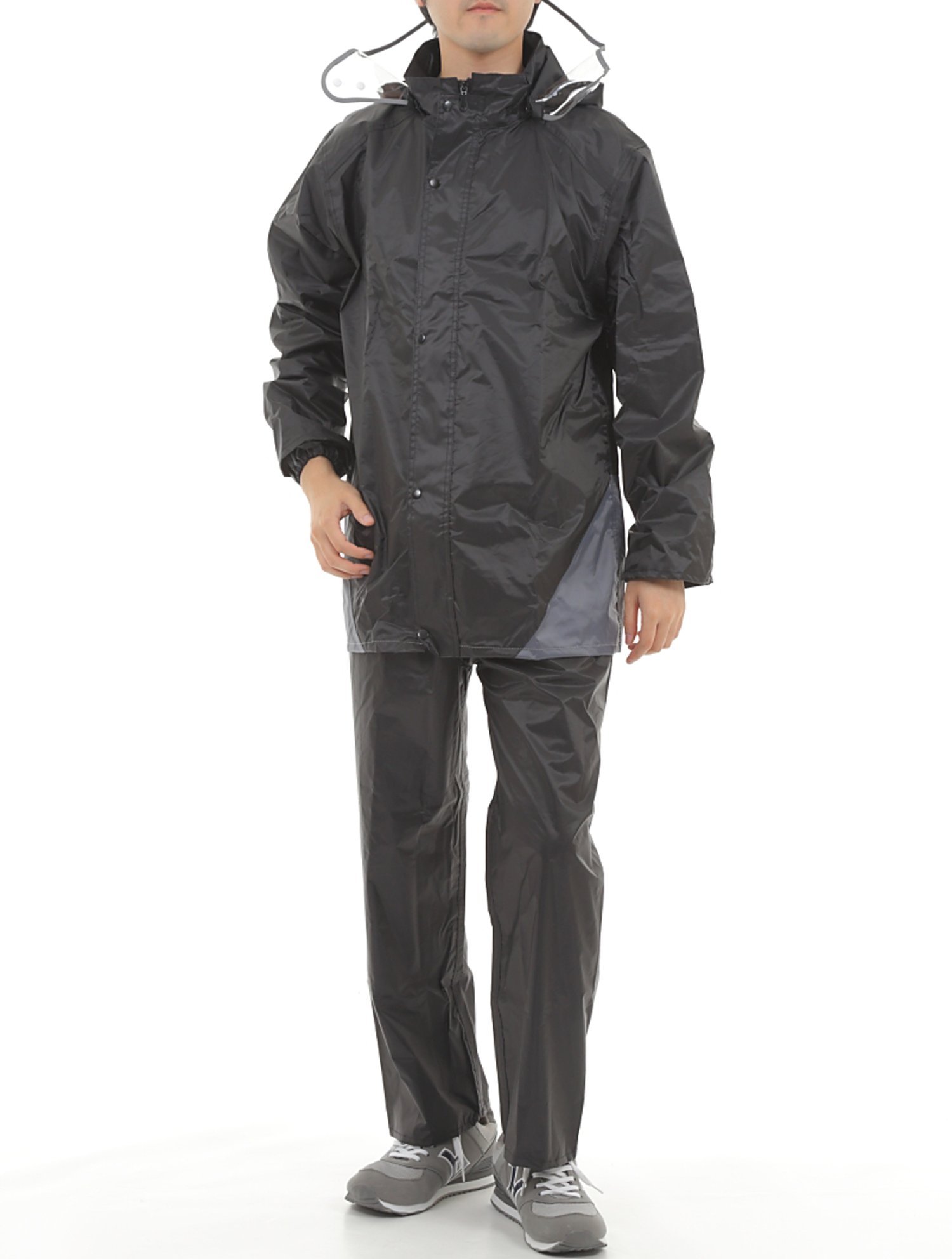 Stylish waterproof rainwear upper and lower set that can be worn by either men or women.