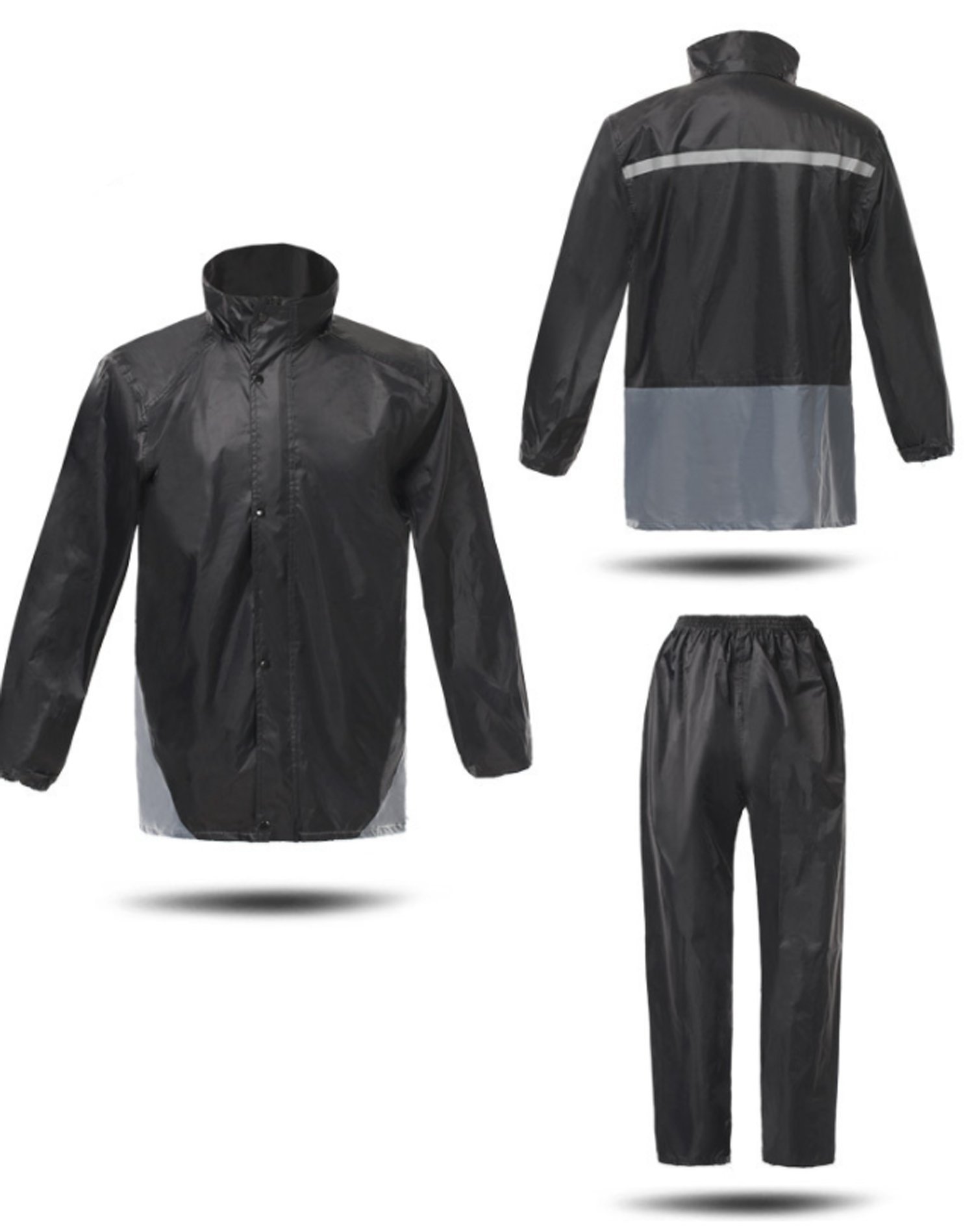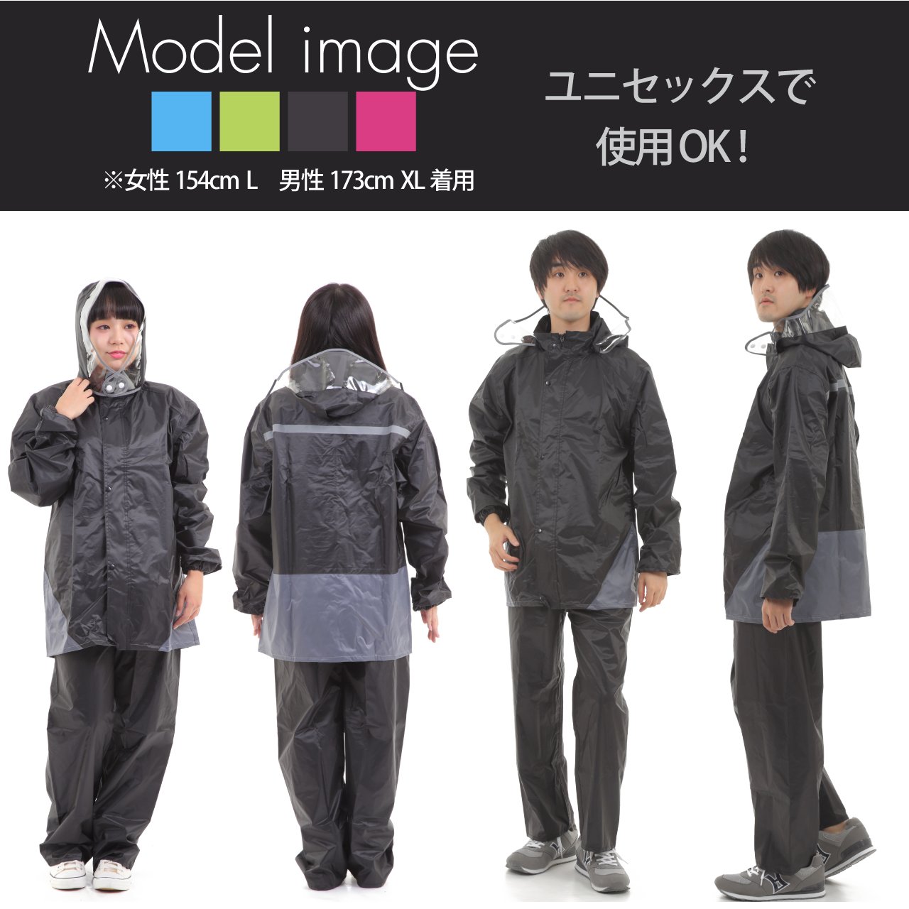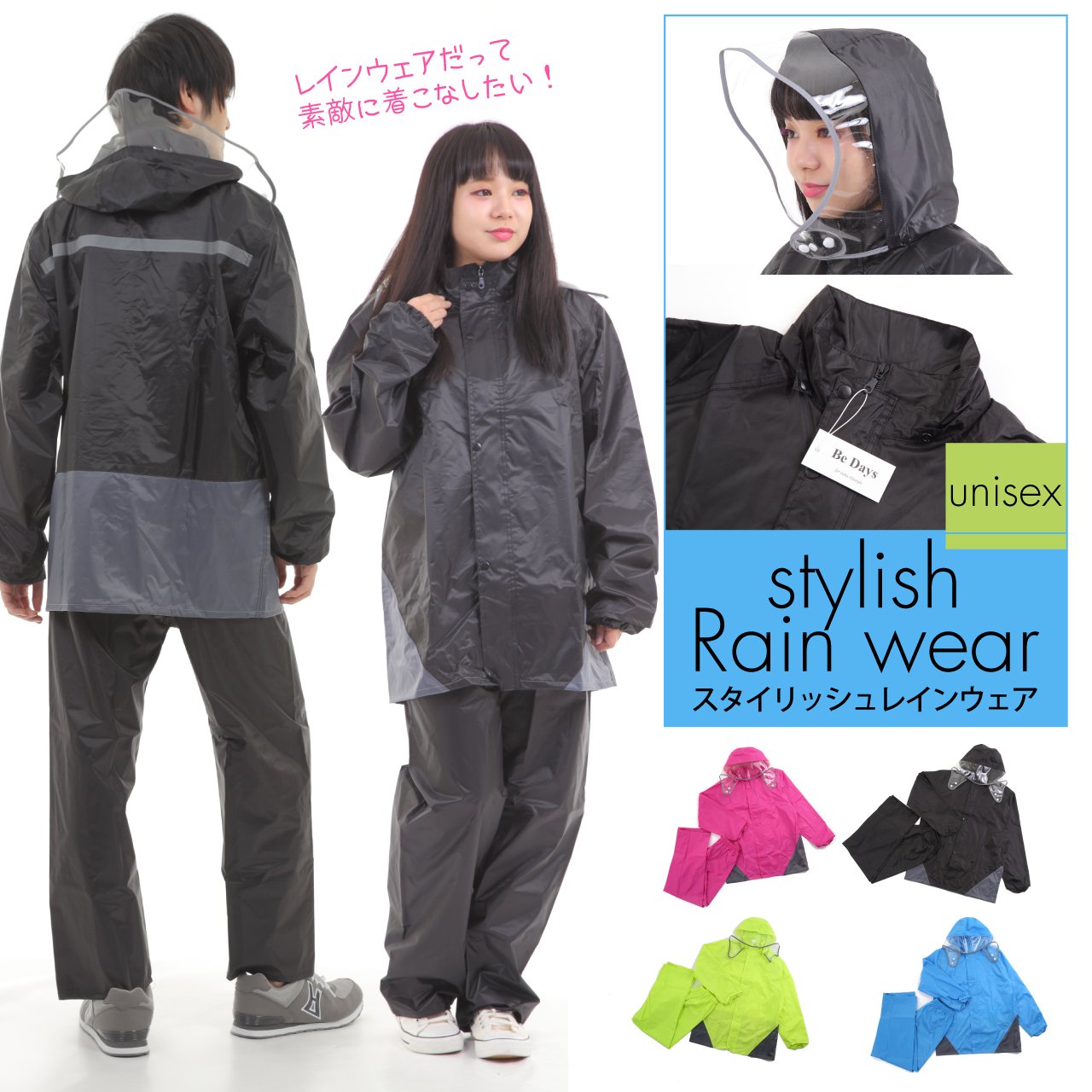 Stylish waterproof rainwear upper and lower set that can be worn by either men or women.