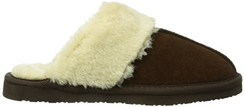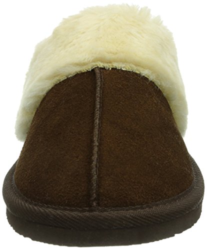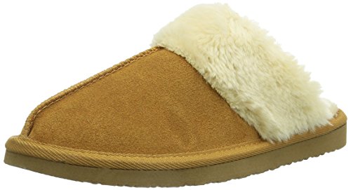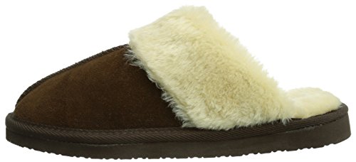 Pile-lined slide-on slipper in suede featuring vertical seam on vamp and textured trim on collar
