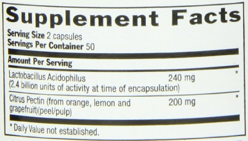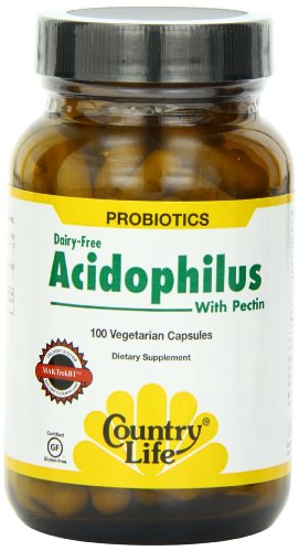 ReleaseDate : 2010-05-07 Studio : Country Life Publisher : Country Life Binding : Health and Beauty Product Description NATURAL ACIDOPHILUS w/Pectin (Milk-Free Dietary Supplement) Provides a natural source of Lactobacillus Acidophilus to help maintain proper intestinal flora.** Acidophilus with pectin provides 2.4 billion live colony forming units per two (2) capsules at time of encapsulation. In a vegetarian capsule. Directions: Adults take two (2) capsules two to four times daily. Other Ingredients: Cellulose, cellulose (capsule shell), maltodextrin, magnesium stearate, stearic acid, silica. Does Not Contain: Yeast, wheat, soy, gluten, milk, salt, sugar, starch, preservatives or artificial color. These statements have not been evaluated by the Food and Drug Administration (FDA). This product is not intended to diagnose, treat, cure or prevent any disease. 0
