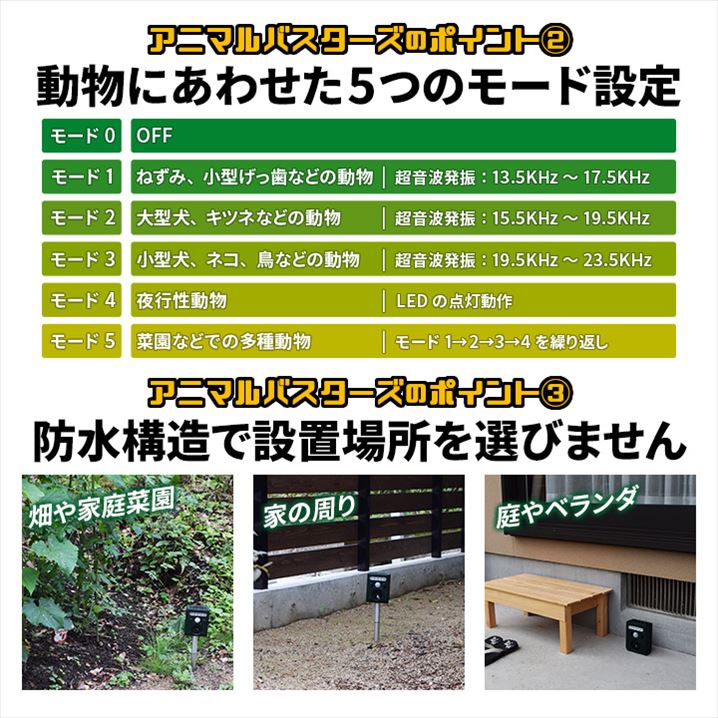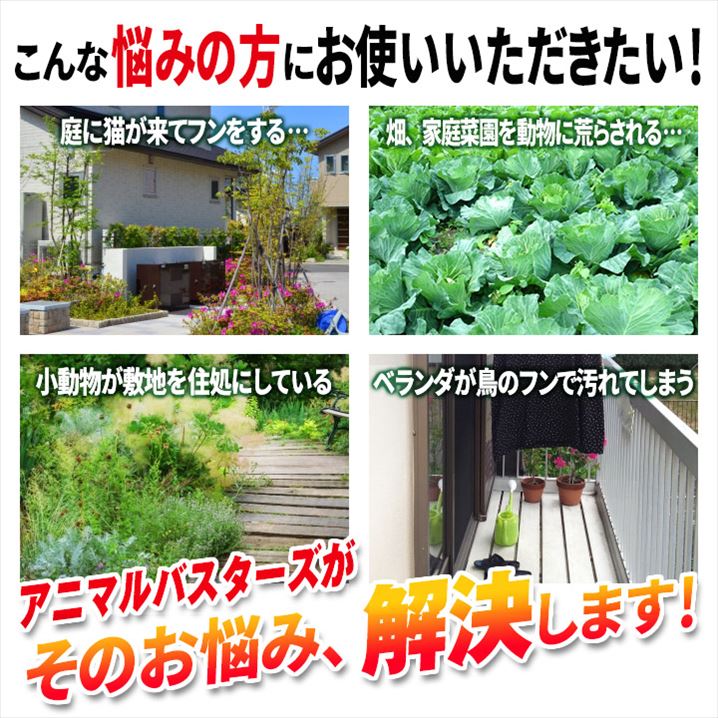 ●アニマルバスターズは超音波と光で動物・鳥を威嚇し近寄らせません。