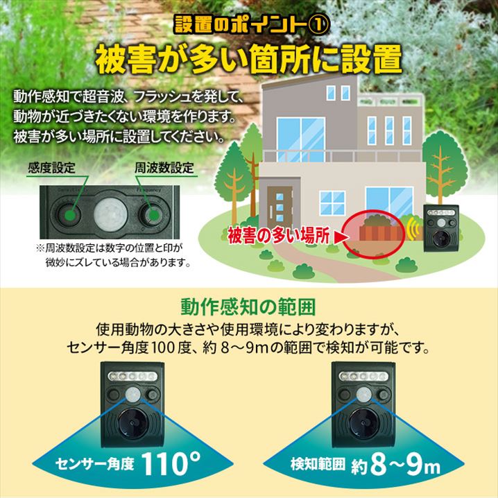 ●動作感知で超音波、フラッシュを発して、動物が近づきたくない環境を作ります。